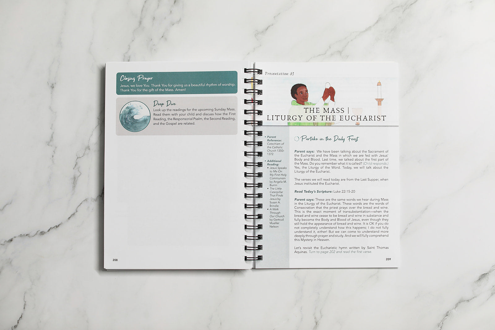 This open-and-go, family-style Catholic faith formation resource teaches rich theology through captivating beauty. Sacred art, hymns, poetry, nature study, copywork, and story bring the truth and goodness of Catholicism to life. Steeped in Sacred Scripture and Tradition, your family can enjoy and experience catechesis together OR your child can complete this independently.