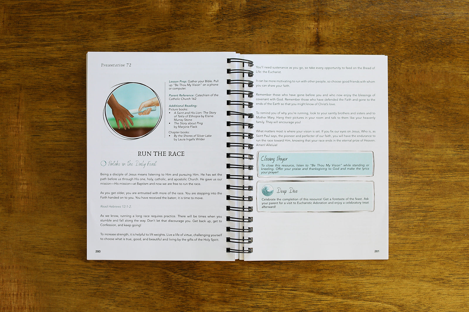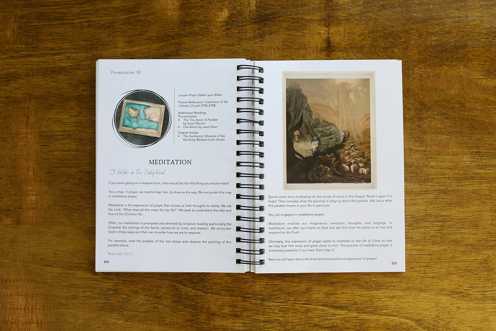 This open-and-go, family-style Catholic faith formation resource teaches rich theology through captivating beauty. Sacred art, hymns, poetry, nature study, copywork, and story bring the truth and goodness of Catholicism to life. Steeped in Sacred Scripture and Tradition, your family can enjoy and experience catechesis together OR your child can complete this independently.